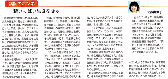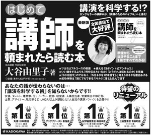 新聞のコラム執筆の他、テレビ・ラジオなどでも活躍中。また、2005年にスタートした【講師塾】では、年間1億円のオファーに応える大谷流の講演・研修ノウハウを惜しげもなく公開。日本で初めて講演を科学するアプローチを用いた講師塾には、オリンピックのメダリストや元Jリーガー、教師、経営者、人事担当者、労働組合の執行部、士業、デザイナー、政治家など、その受講者は、1,400人を超える。